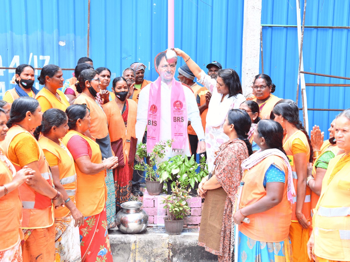 Hyderabad: A day after chief minister K Chandrashekar Rao (KCR) announced a salary hike for sanitation workers in rural and urban areas of the state, a video has emerged where paala-abhishekam (pouring of milk as a sign of respect and devotion) was performed on a cut-out of the CM.