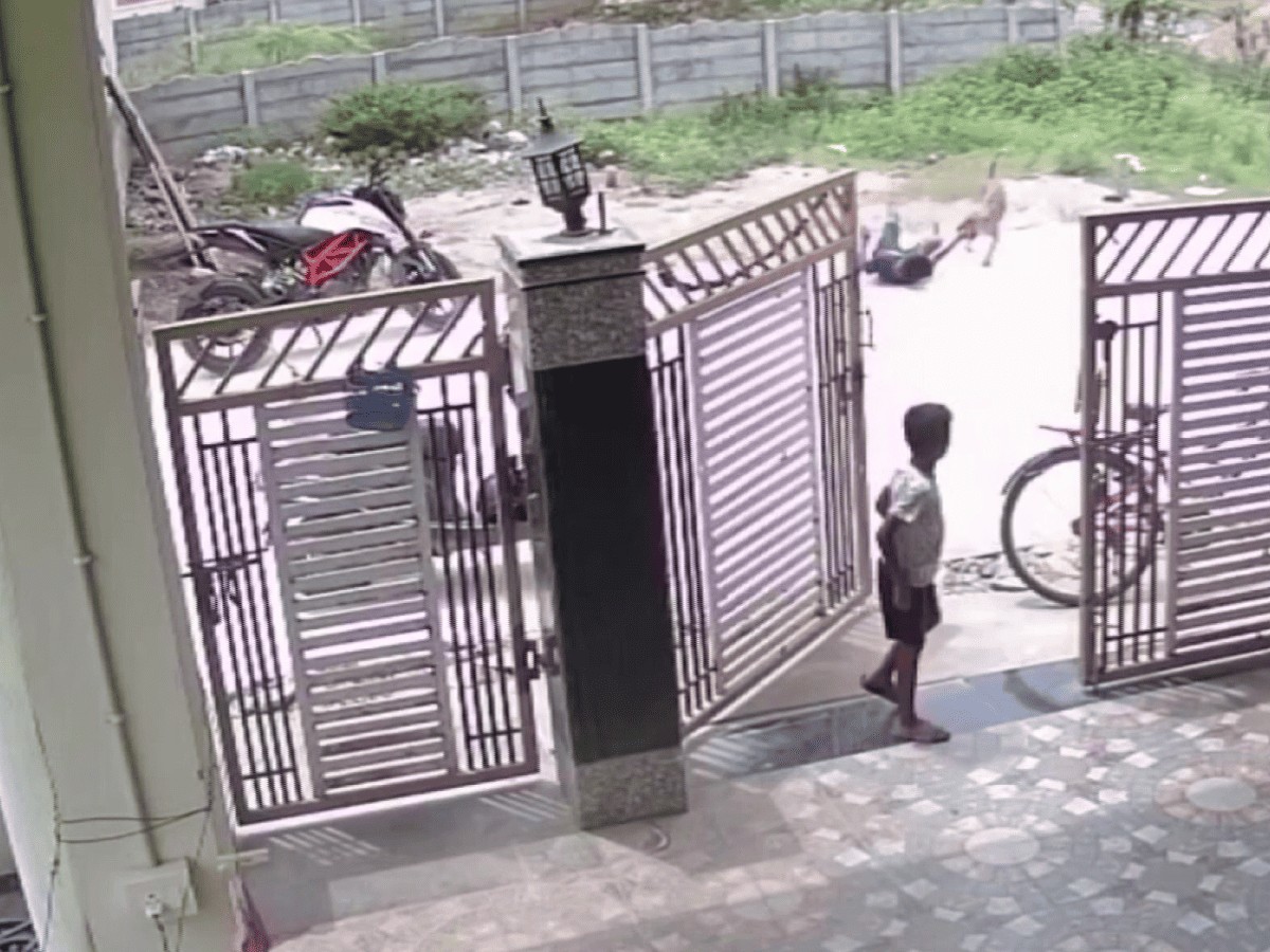 In video footage, the boy Sai Charit, 10, is seen playing in front of his house when a stray dog suddenly runs towards the boy and attacks him.