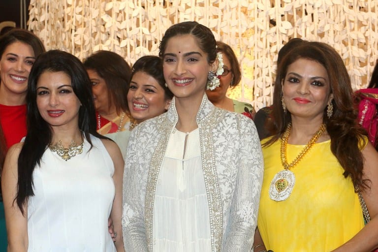 Bollywood actress Sonam Kapoor(C) poses as she attends “The Women Entrepreneur Exhibition” in Mumbai on August 23, 2016.
