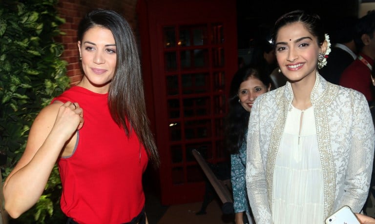 Australian Olympic swimmer Stephanie Rice(L) and Indian Bollywood actress Sonam Kapoor pose as they attend “The Women Entrepreneur Exhibition” in Mumbai on August 23, 2016.