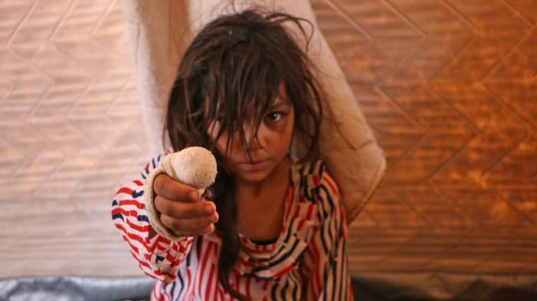 A displaced Syrian girl who was wounded by shelling sits at a camp in Kafr Lusin near the Bab al-Hawa border crossing with Turkey in the northern part of Syria’s rebel-held Idlib province on September 6, 2018.