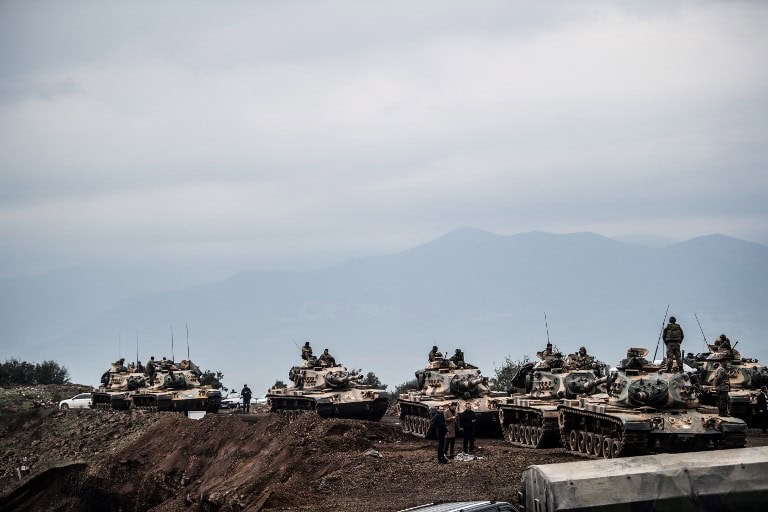 Turkish army tanks wait near the border before entering Syria, on January 21, 2018 at Hassa, in the Turkish province of Hatay, near the Syrian border.