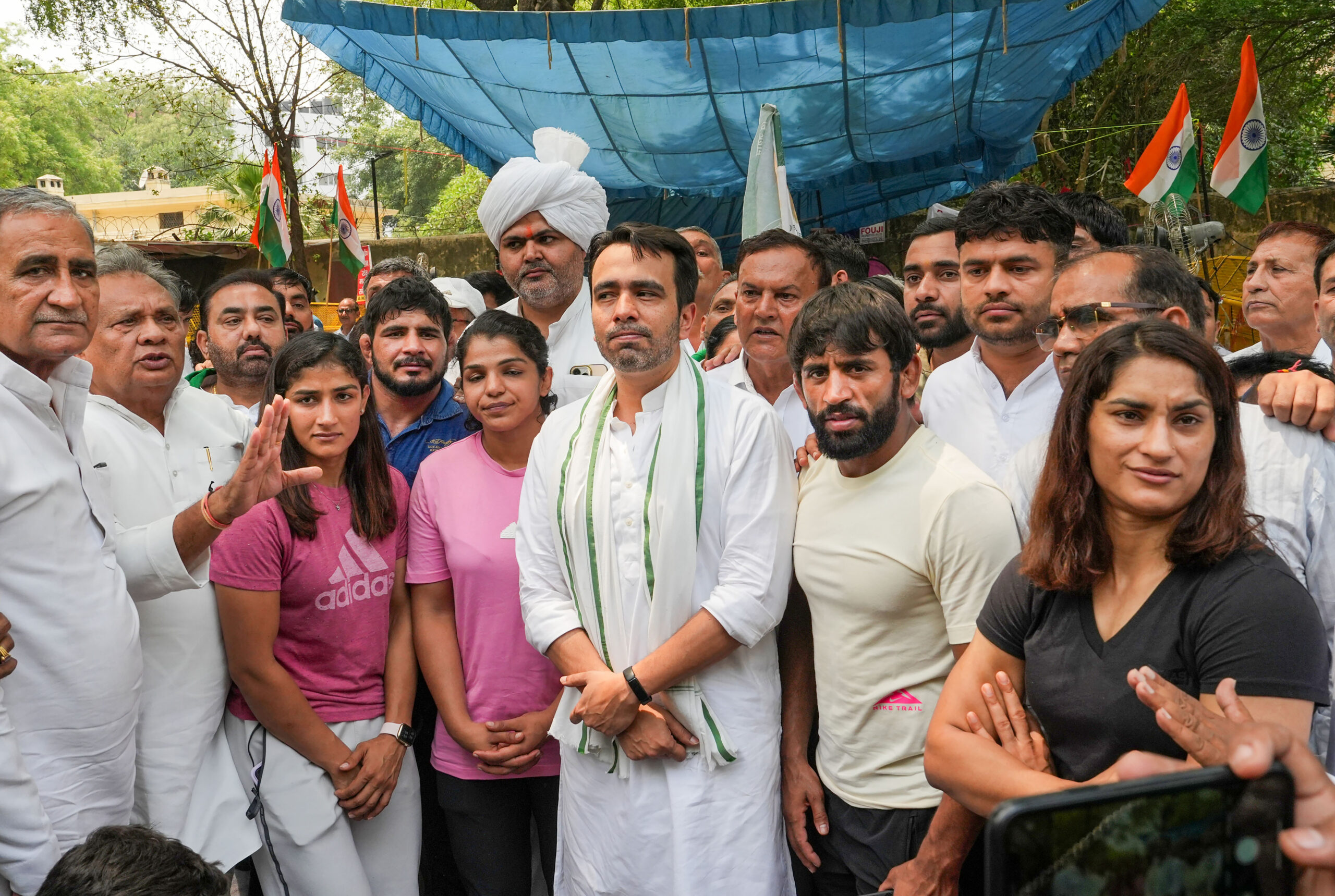 New Delhi: Members of Khap Panchayat with wrestler Bajrang Punia during the wrestlers’ protest at Jantar Mantar, in New Delhi, Thursday, April 27, 2023. (PTI Photo/Manvender Vashist Lav)