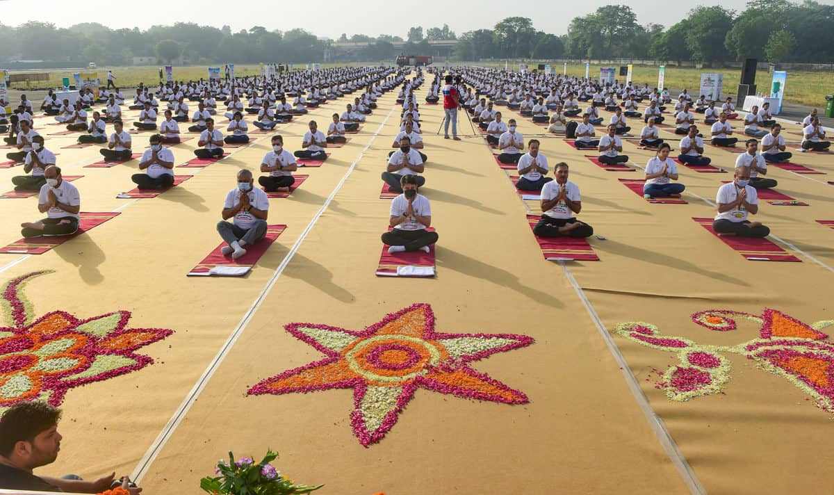 New Delhi: Union Minister for Civil Aviation Jyotiraditya M. Scindia leads the mega Yoga event ‘Yog Prabha’, at Safdarjung Airport runway, in New Delhi, Monday, April 25, 2022. About 500 people of the ministry took part in the Yoga event. (PTI Photo/Kamal Kishore)
