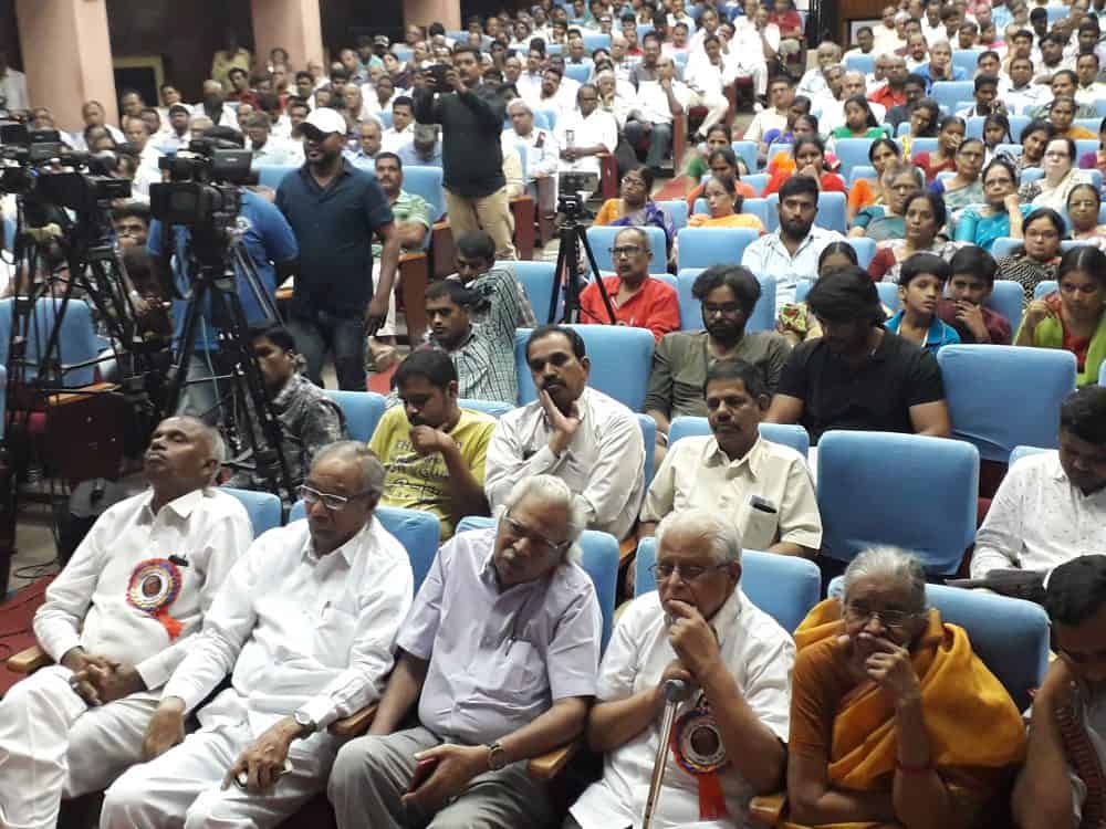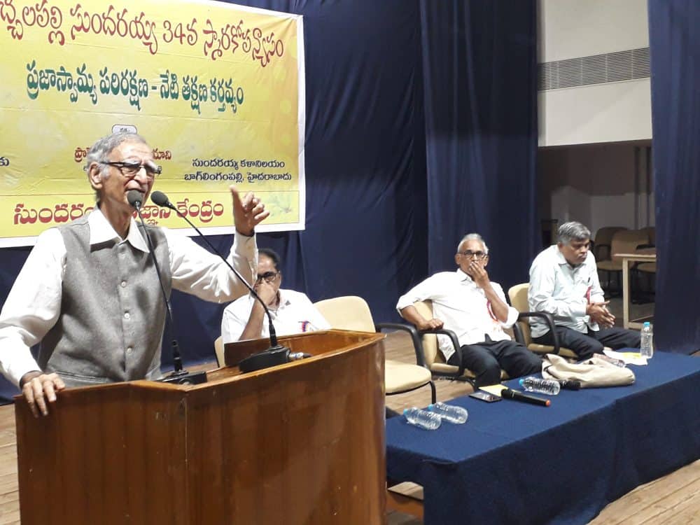 It has been observed for the first time in the history of India that when a person goes to the house of God for getting peace and tranquility, a team of cameramen also follows him to film the scenes of offering ‘Puja’ and ‘meditation’ so that cheap popularity could be achieved. With great regret, it is to be told that this act was not performed by no other person than our Prime Minister, Mr. Modi himself. These thoughts was expressed by noted social activist and historian, Mr. Ram Punyani delivering 34th Sundarayah Memorial Lecture at Sundarayah Bhavan, Bagh Lingampally. (Photo: Zabi)